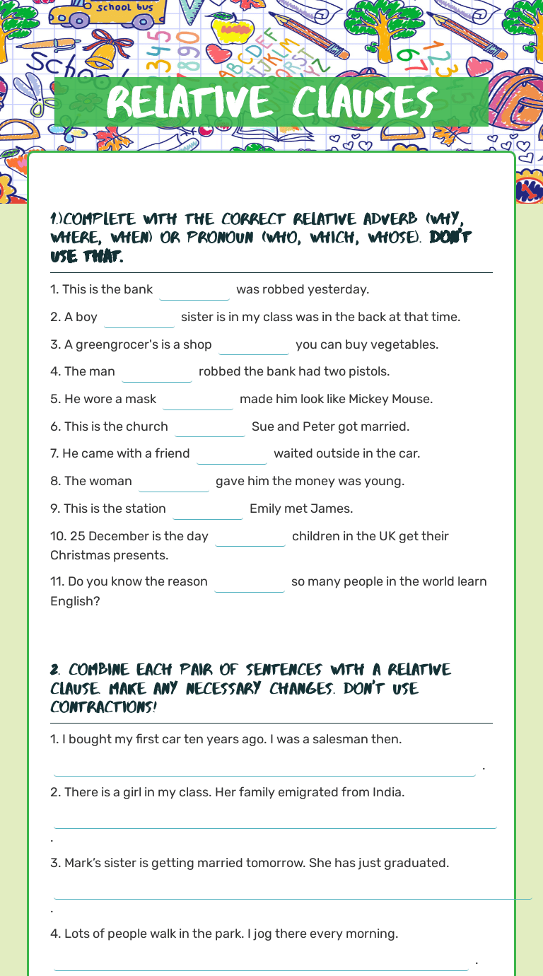 Free interactive exercises to practice online or download as pdf to print. Relative pronouns worksheets and online activities. In these worksheets, students identify relative pronouns and relative clauses. 'that' and 'whose' are relative pronouns that can be used when referring to things, . Underline the noun that it modified.